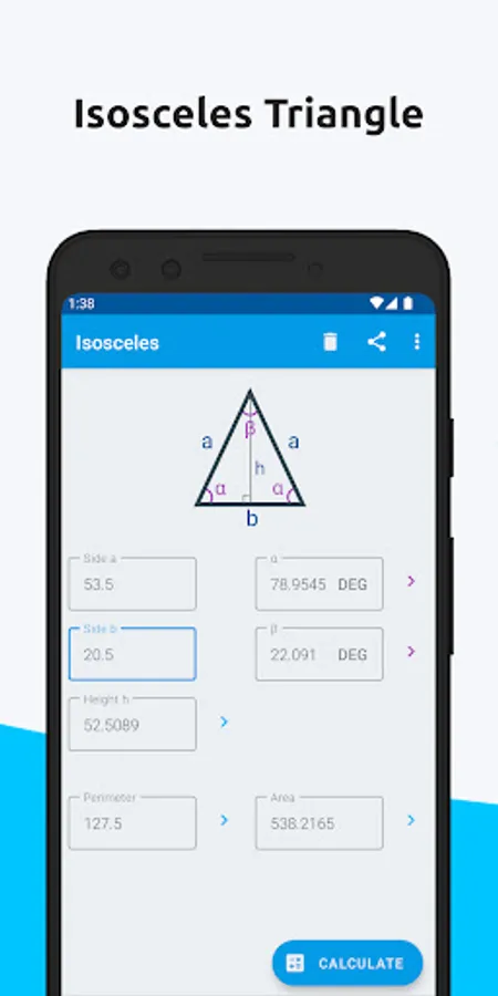 • In the Isosceles triangle you can calculate only angles. In addition to obtaining sides, angles, area and perimeter, it includes the calculation of height.