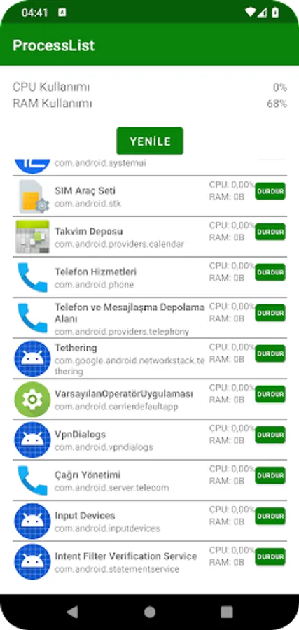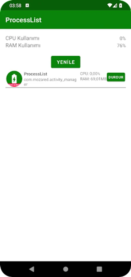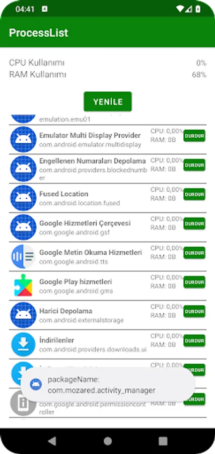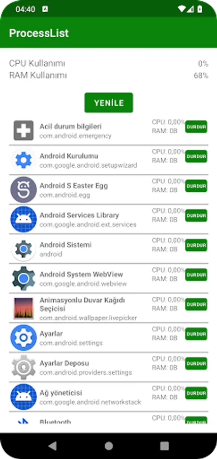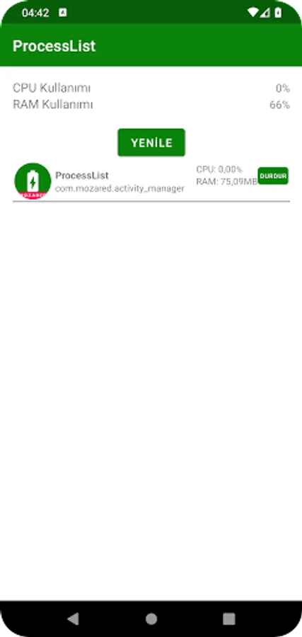 This application displays information about all the apps running on your device, such as CPU usage, RAM usage, package name, app name, icon, and more. The main screen features a scrollable list of all the apps in order, along with a refresh button. When you tap the close button next to any app on the list, the app will be closed. At the top of the screen, you can see the real-time RAM and CPU usage of your device.