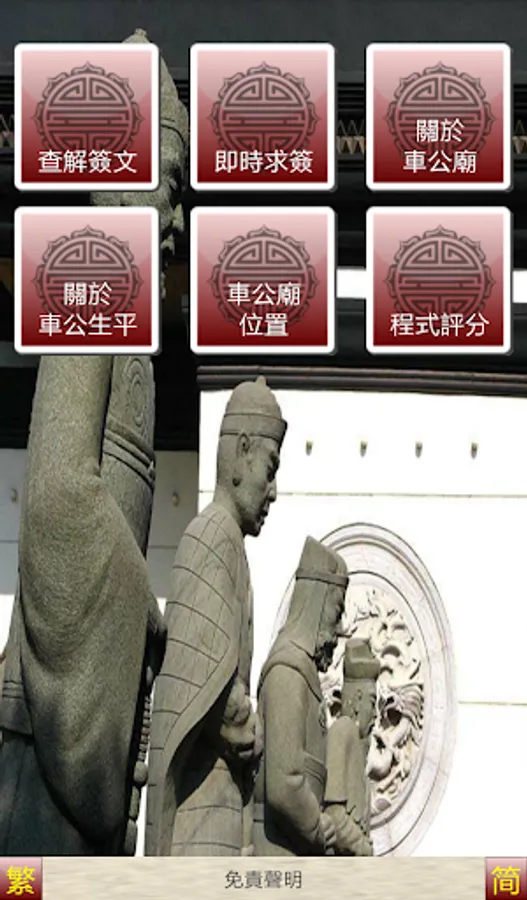 Also known as Tai Wai Che Kung Miu Che Kung Temple, commonly referred to as Che Kung Temple, Sha Tin, New Territories, Hong Kong is a memorial Tai Wai Che Kung temple in Hong Kong, a Grade II historic building, is a famous temple in Hong Kong, a lot of people will come here, to pray for the blessing. The software 'Hong Kong Che Kung Ling checkin' according to Che Kung Ling signed this ancient design, provides divination, check solution to sign the text and records. The use of this software, users can learn more about Che Kung Ling sign mystery, also in the car to the temple to pray personally, self-check solution to sign the text.