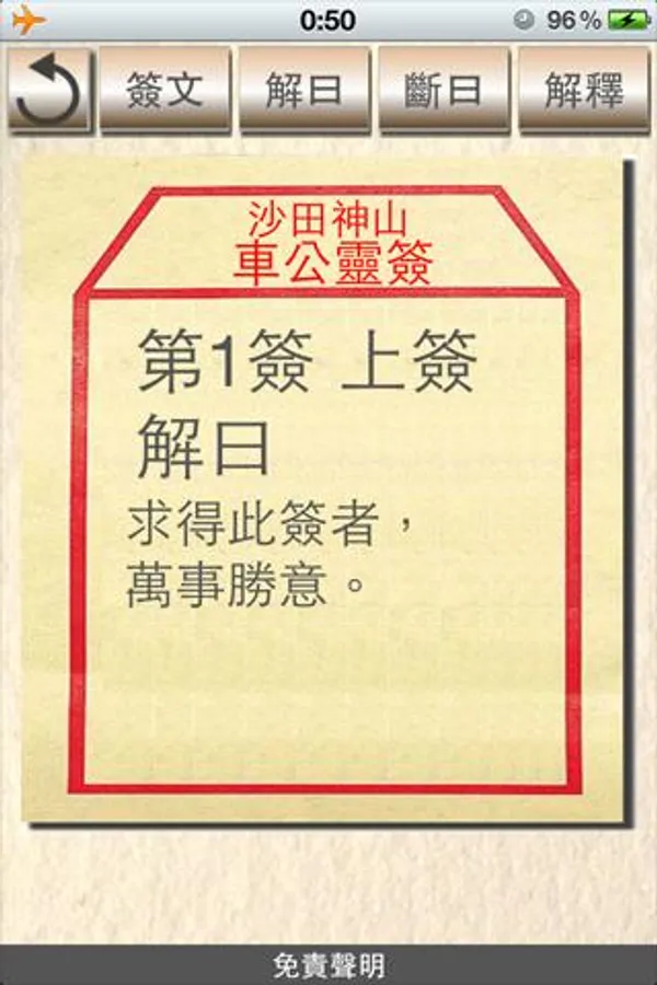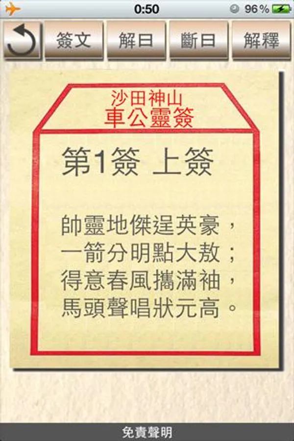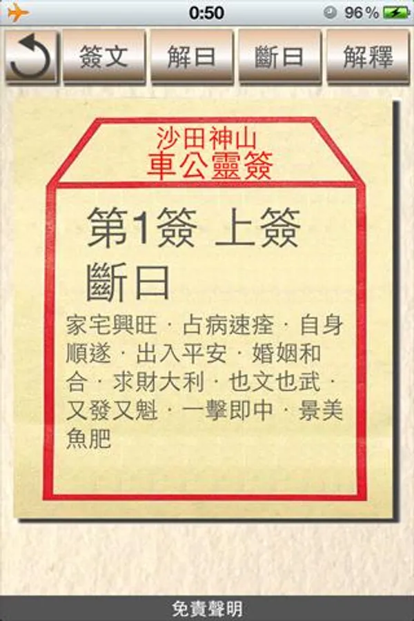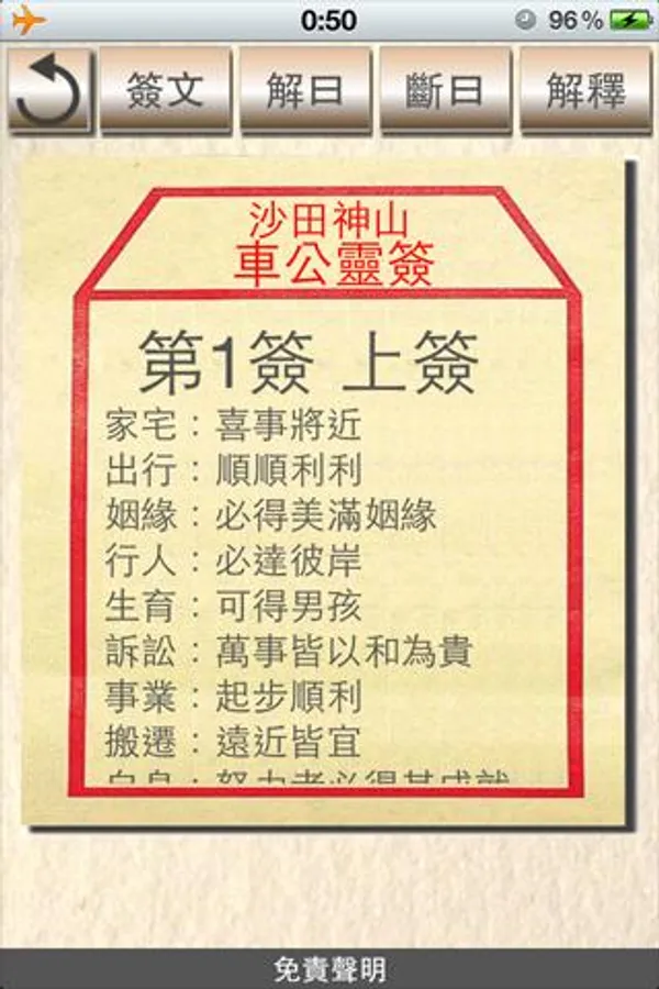 This software is recommended to pray and search solutions to sign the text feature is only for reference, content and procedures may be inadequate, but does not guarantee their accuracy and reliability of the information generated by this software, and shall not on account of the information for any inaccuracies or omissions and any loss or damage of any liability arising. The public should understand metaphysics numerology is not an exact science, fate always rely on ourselves.