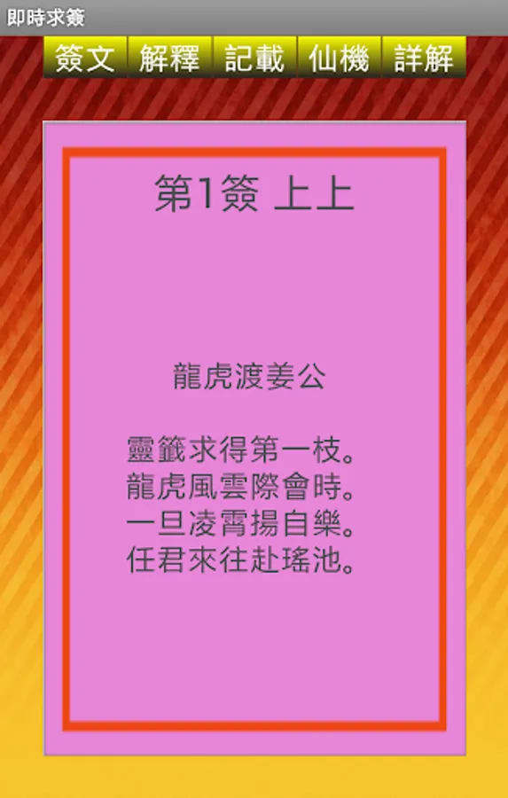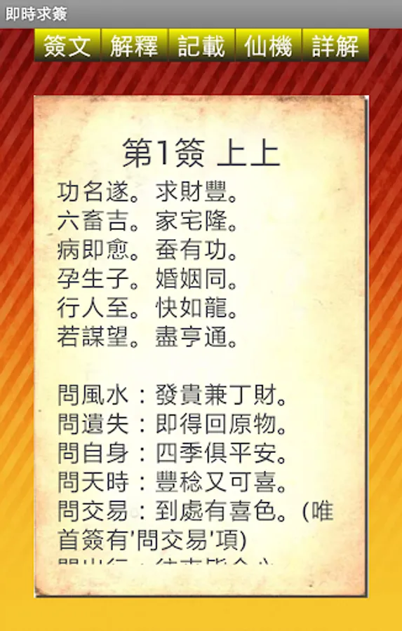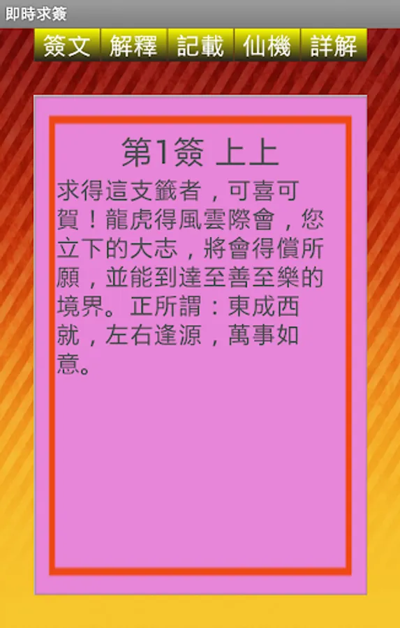 This software is recommended to pray and search solution to sign the text is only available for reference, content and procedures may be inadequate, but does not guarantee their accuracy and reliability of the information generated by the software, and there was not information on of any inaccuracies or omissions whatsoever for any loss or damage bear any responsibility. The public should also understand metaphysics numerology is not an exact science, fate always rely on ourselves.