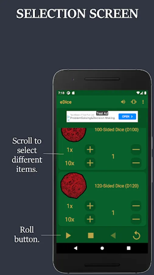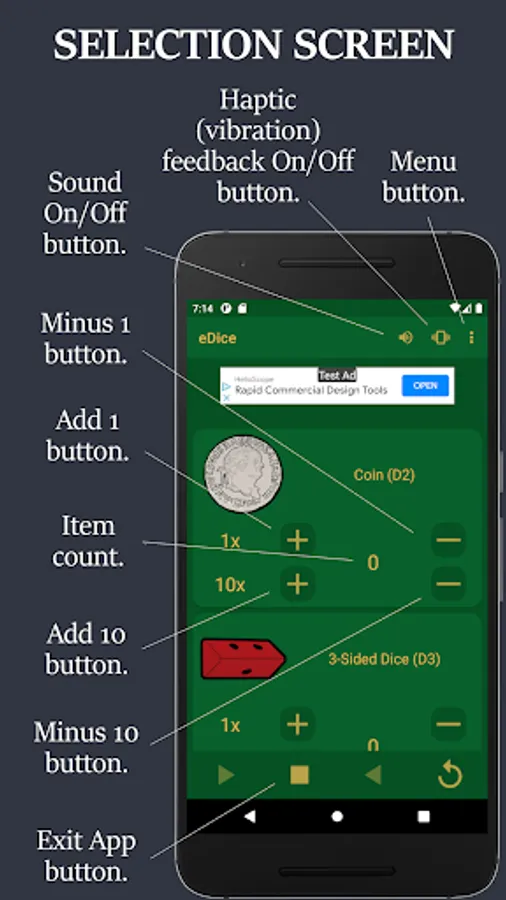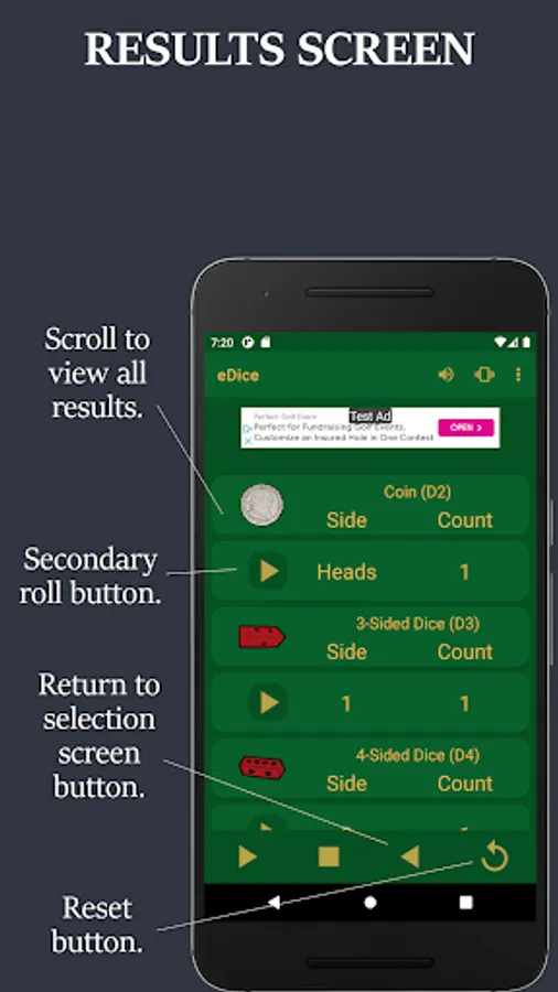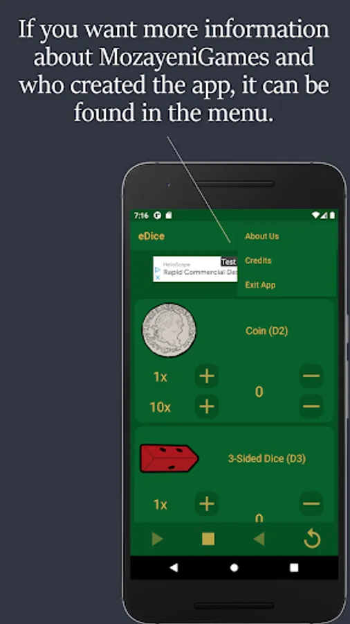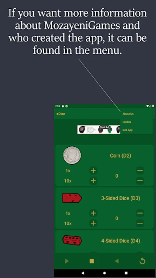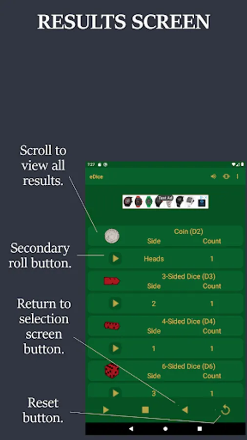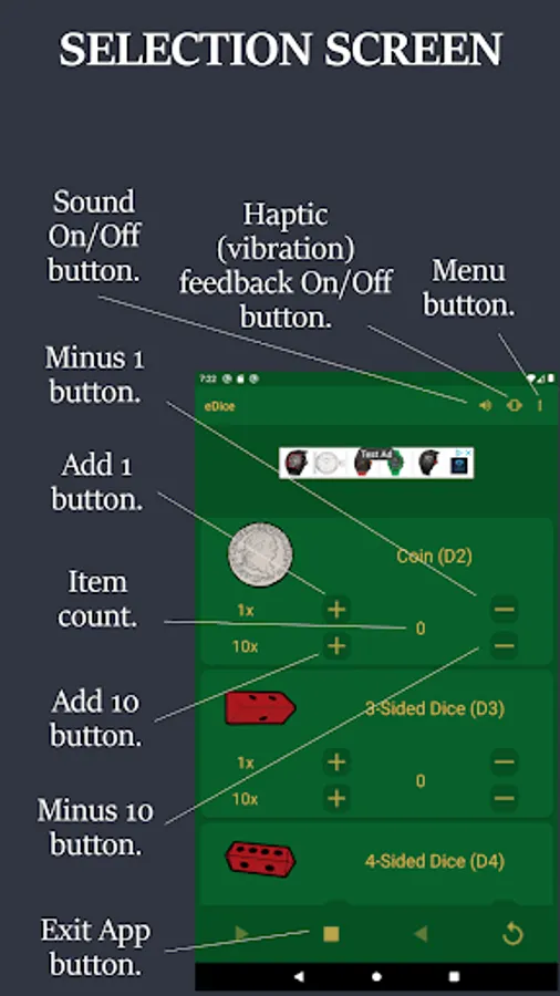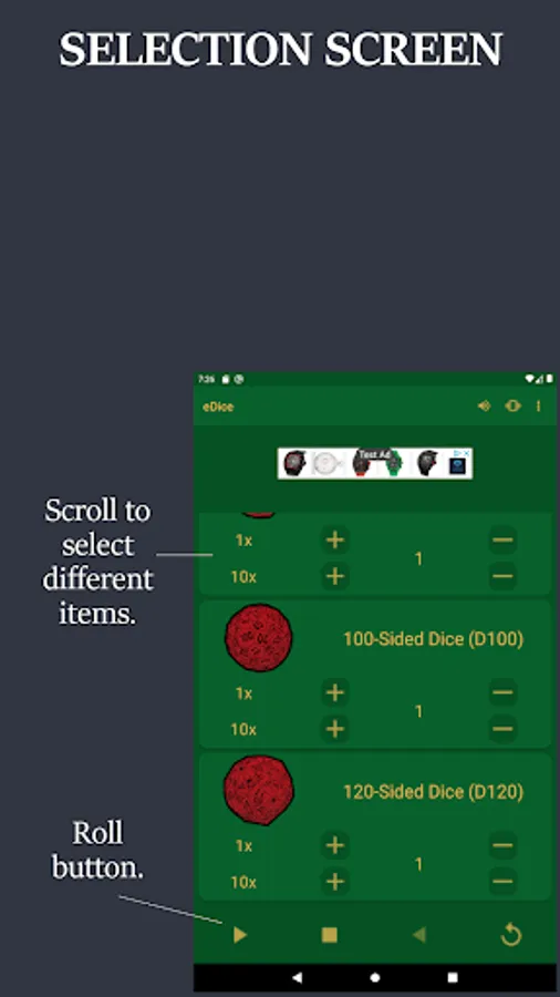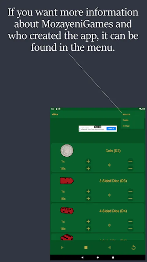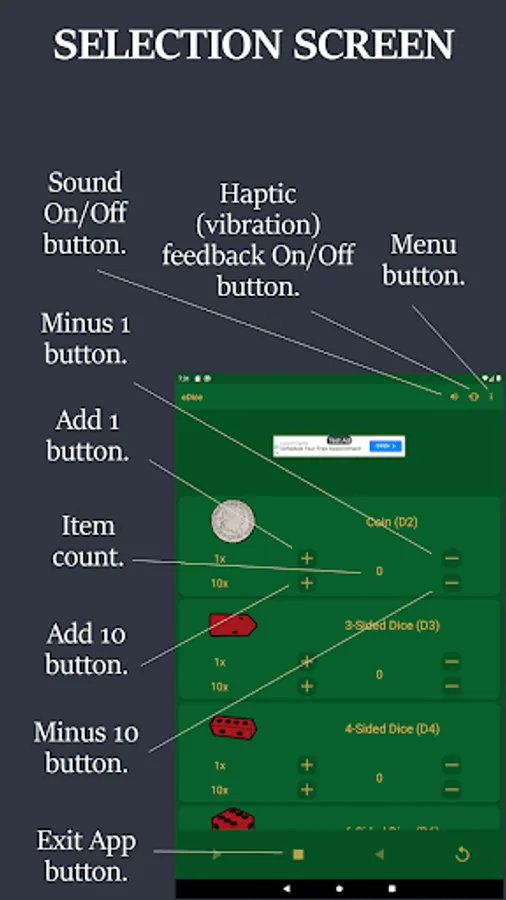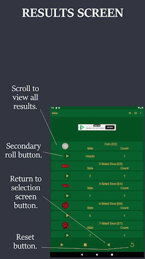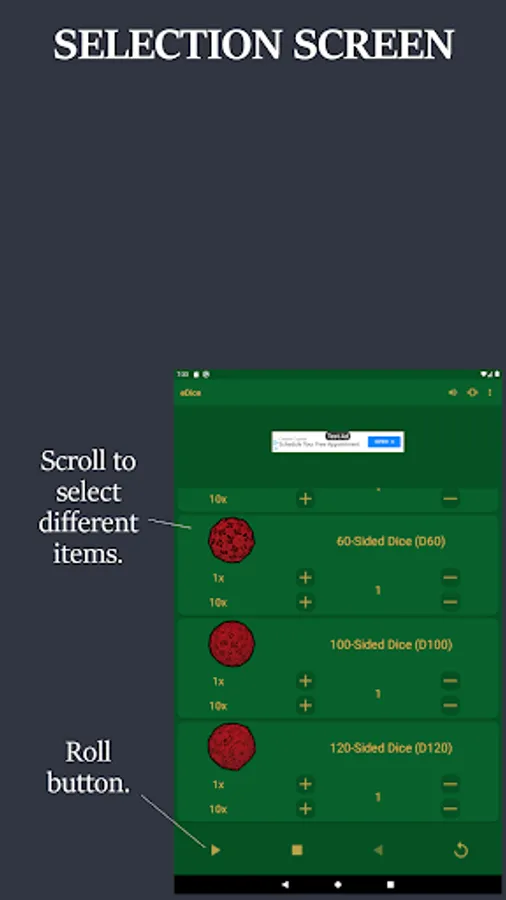 NOTE: eDice is a free to use ad supported app. You will see an ad at the top of each screen and when you exit the app.