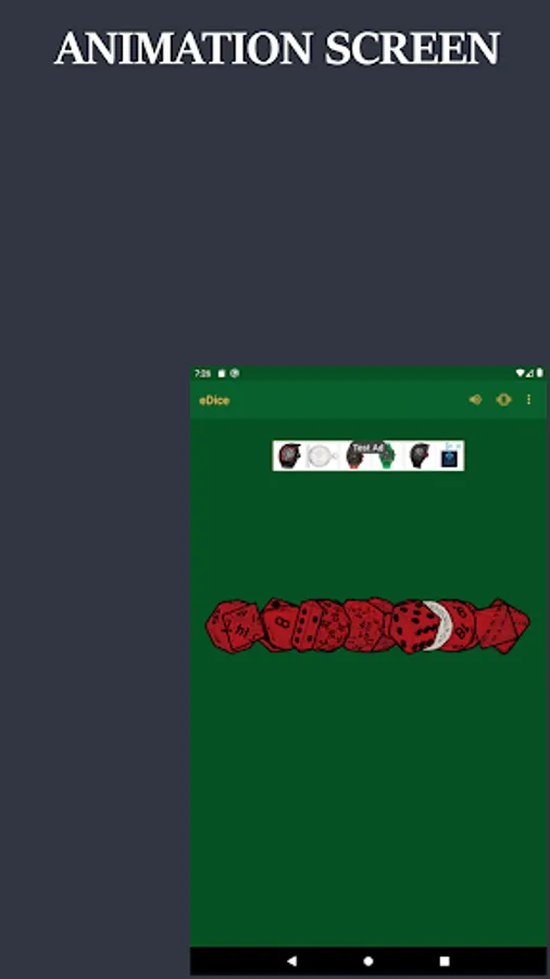 Between rolls, eDice will run an animation screen. The screen will show the first 24 coin(s)/dice being rolled. If you selected more than 24 coin(s)/dice to be rolled then the animation screen will go into representation mode, where your selected coin(s)/dice will be rolled, but only the dice type(s) will be displayed in the animation.