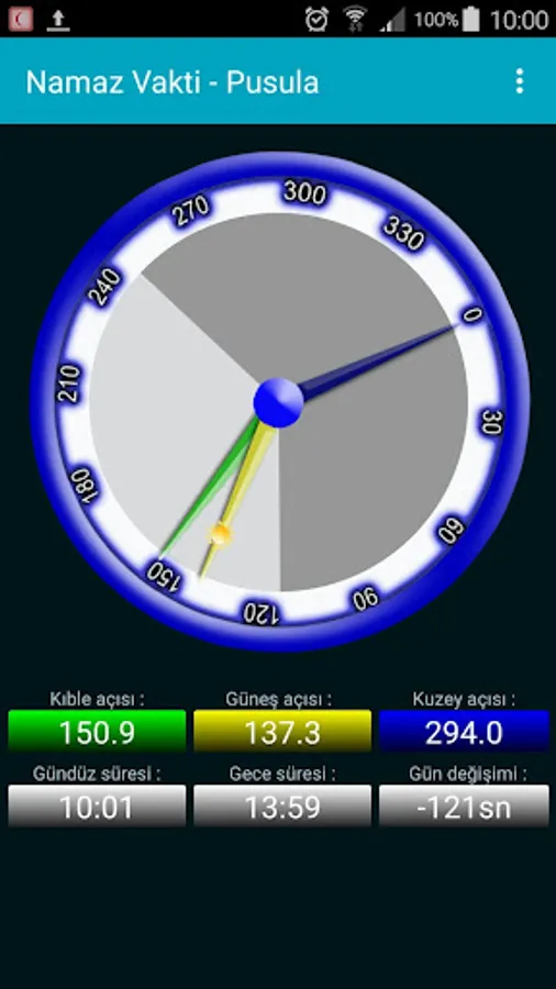 Ayrıca kıble yönünün tayinini güneşe,aya ve manyetik kuzeye göre yapabilirsiniz. Pusula üzerindeki ibreler manyetik kuzey, güneş, ay ve kıble yönünü gösterecektir.