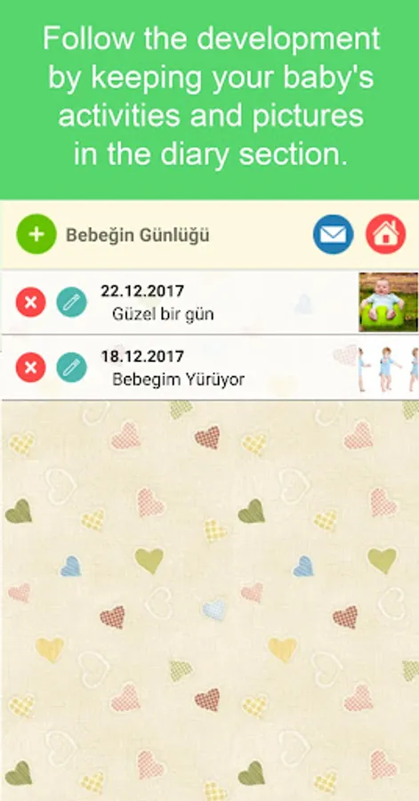 By using the "Diary" section of our application, you can save your baby's activities day by day.