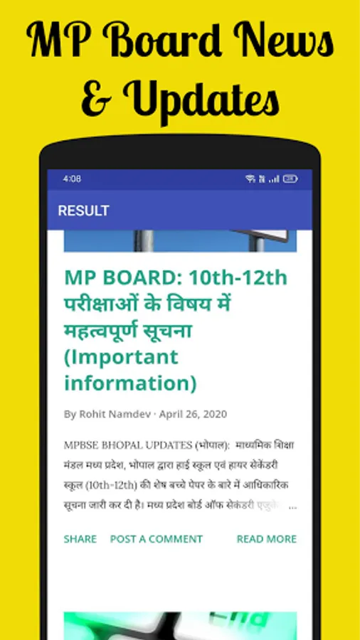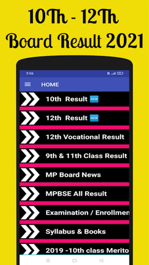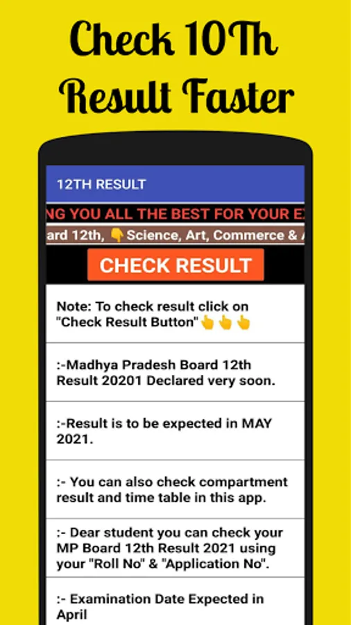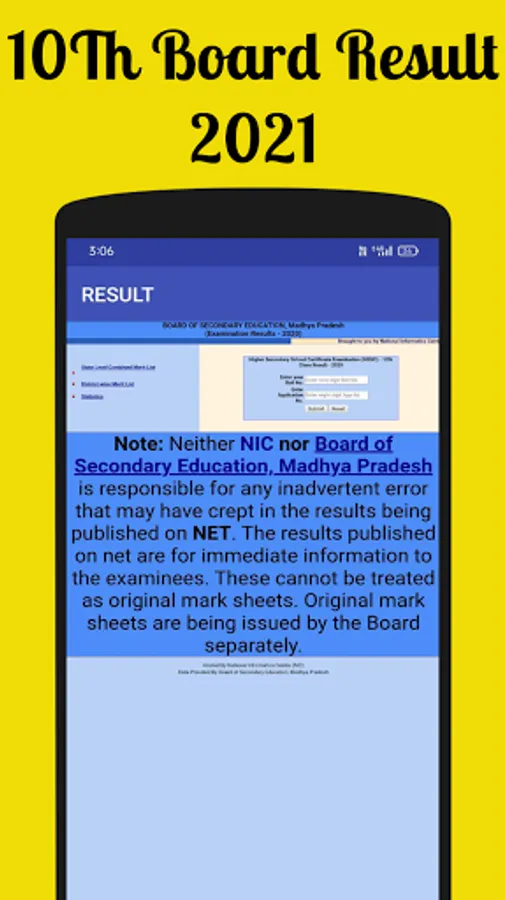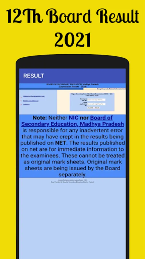 The MP Board Result android app now in your finger tips. this android app designed to access from anywhere anytime on you mobile. no need to go anywhere to check your results. Just download our MP board result android app and check your result in your mobile. This android app is very simple to use in your Mobile. And also get latest information and notification. you can download this app for free and view your result.