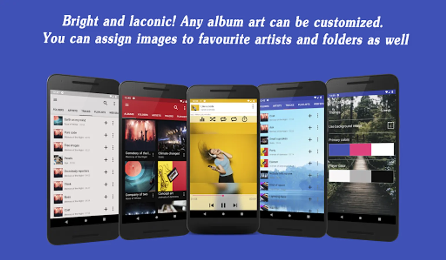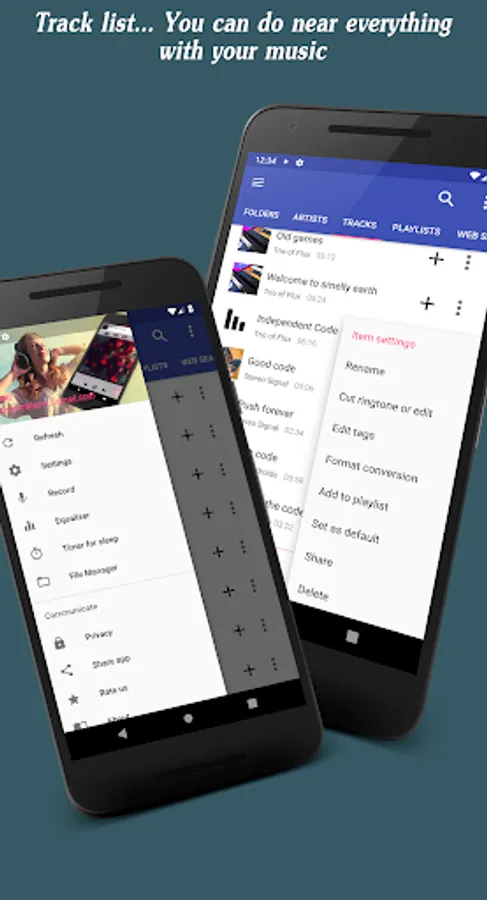 *Under music library management we meen folder, album, artist, playlist structuring and mp3 music tagger. You can download music, or upload it on your phone in any way, and any place. If you, for example, want to move your music library from PC, it will save its folder structure, and will be properly displaid withing interface, no need to create additional playlists. They often call it folder player. With embeded mp3 music tagger functionality, you can deal separately with your artist, or album, for example, rename/delete artist or change album art for the whole album.