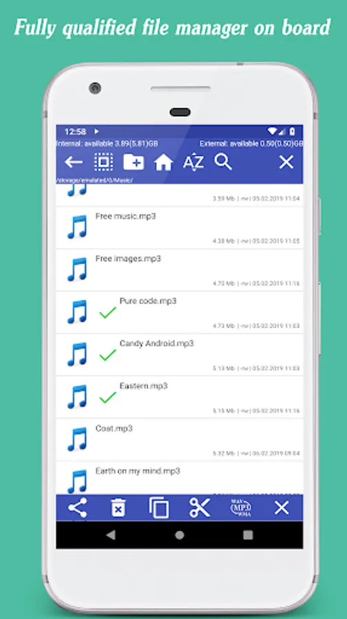 *File manager is lightwight utility to manage your files on embedded storage or removable sd card. You can access all files, not only music