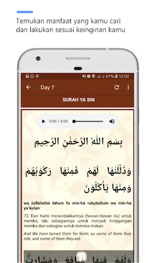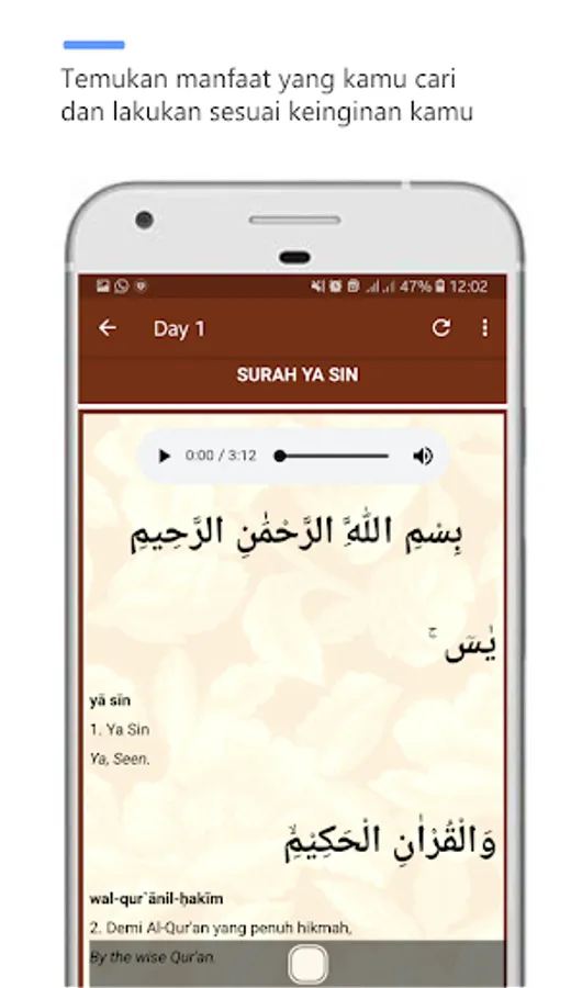Surah Yasin MP3 is an application that displays passages from the letter Yasin along with translation into Indonesian. Also equipped with the reading in Latin to help you read the letter Yasin.