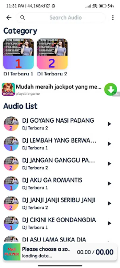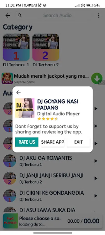 Dj Goyang Nasi Padang, a sophisticated music player application, is the first choice for music lovers. With a complete collection of songs from various genres such as Dj music, classic and the latest, this application offers a music experience without limits. The attractive playlist feature allows users to create personal playlists according to their tastes, while the option to share songs via social media enriches interaction with friends. Dj Goyang Nasi Padang comes with an intuitive interface and integrated lyrics, as well as the latest technology that delivers clear sound on various devices. This application also allows users to become stars with passionate singing. With full audio format support, free download features, and access without logging in, Dj Goyang Nasi Padang delivers an impressive music experience. Easily get the latest song updates, music recommendations and watch music videos. Music for various moods such as party, sleep, sports, relaxation, meditation, and work, all of which can be enjoyed through this application. Dj Goyang Nasi Padang provides a personal music player with stylish playlists and music inspiration that accompanies vacation trips, driving, and helps relieve stress. Uninterrupted access and an attractive appearance with night mode make this application even more superior in the Play Store. High quality stereo sound maximizes the music experience of the users. What's more, the app can be downloaded for free and is compatible with both Android and iOS devices. Available in multiple languages, quick search by mood, as well as a shuffle player feature that brings the music to life in an incredible way. Make Dj Goyang Nasi Padang a loyal companion in your musical adventures.