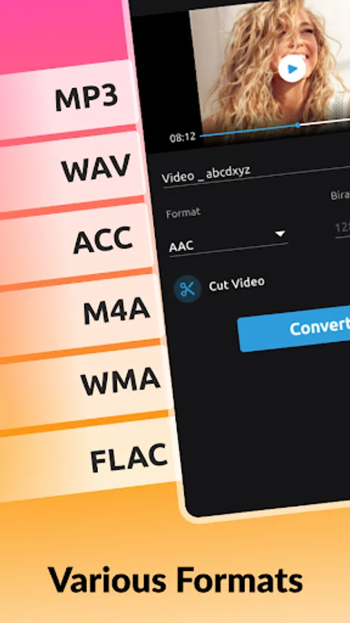 - Converts all video formats - video to audio converter: MP4 to MP3, MKV, WMV, VOB, FLV, DlvX, MOV