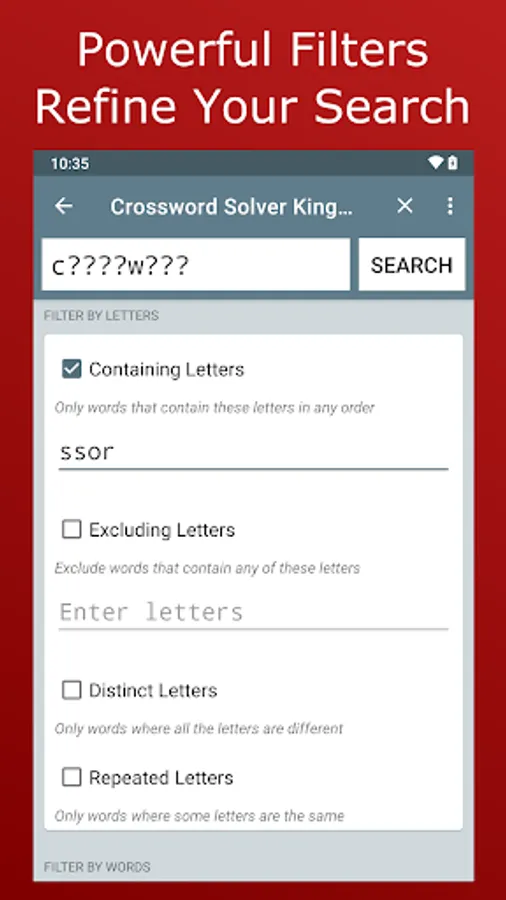Use ? (press space) to represent a missing letter, try c????w??? to find clockwork and crossword