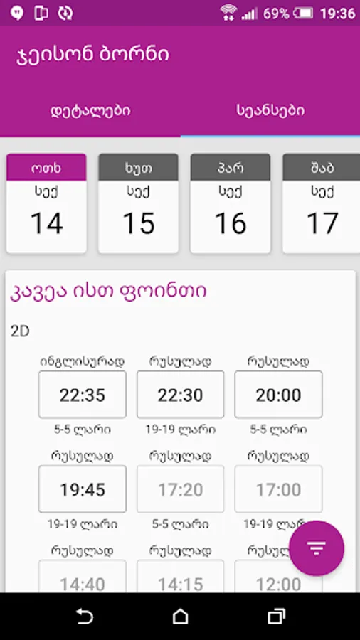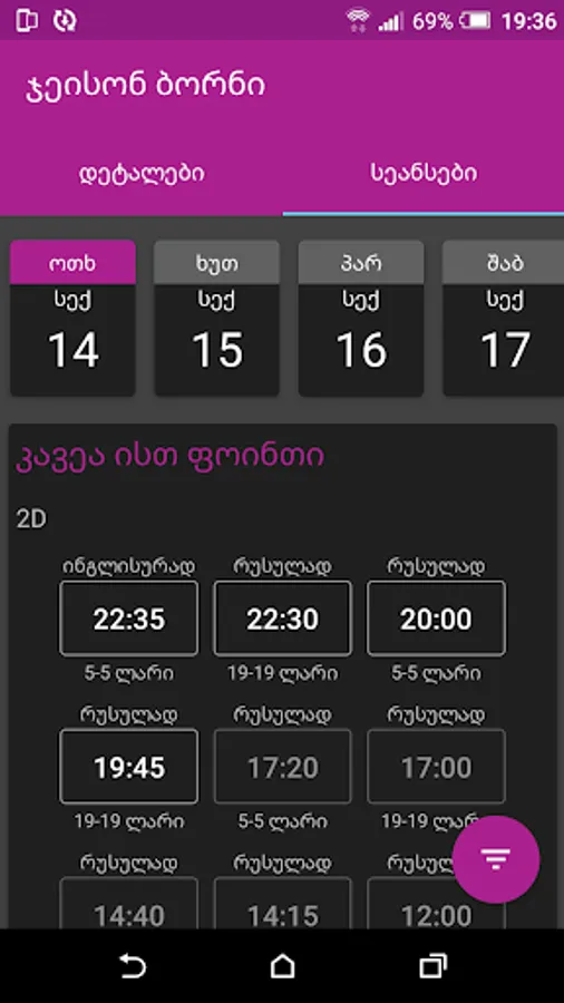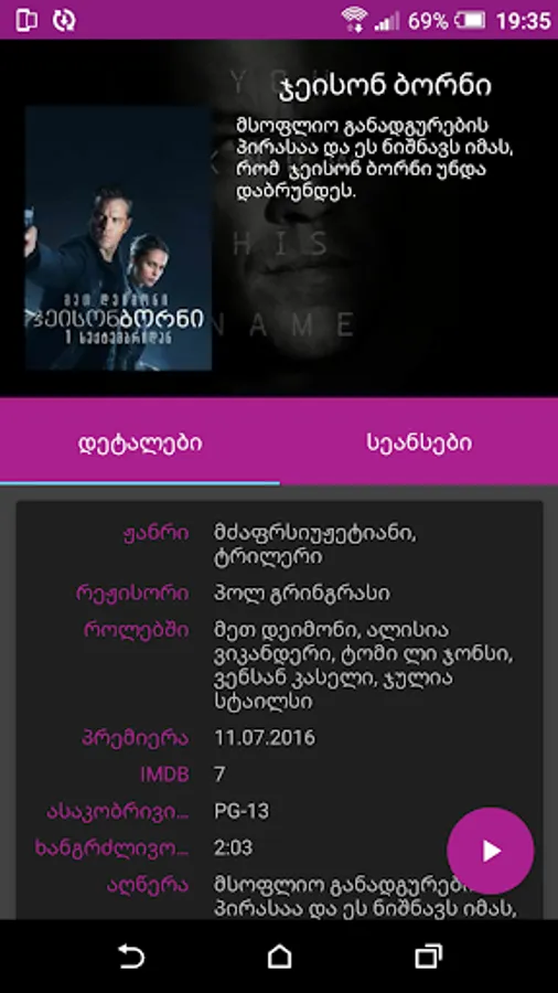 აპლიკაცია განკუთვნილია ფილმის მოყვარულთათვის. შესაძლებელია საქართველოს კინოთეატრების ფილმების სეანსების ნახვა, ფილტრაცია: ფასის, დროის, ენისა და კინოთეატრის მიხედვით. ადგილების დაჯავშნა და ყიდვა. დიდი დარბაზებისთვის ადგილების მიახლოება "pinch zoom"-ით.