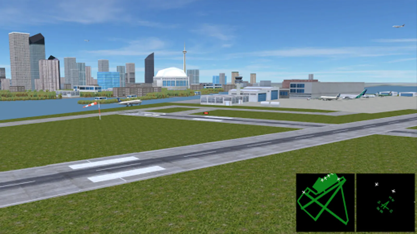 There is a choice of four different view perspectives: tower view, runway view, sky view, and pilot view. In this version, we include two radar screens: one for airborne traffic and one for ground traffic.