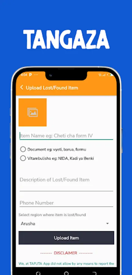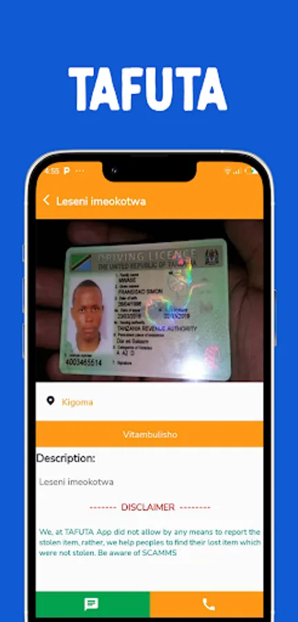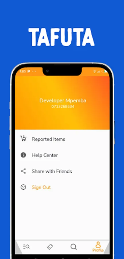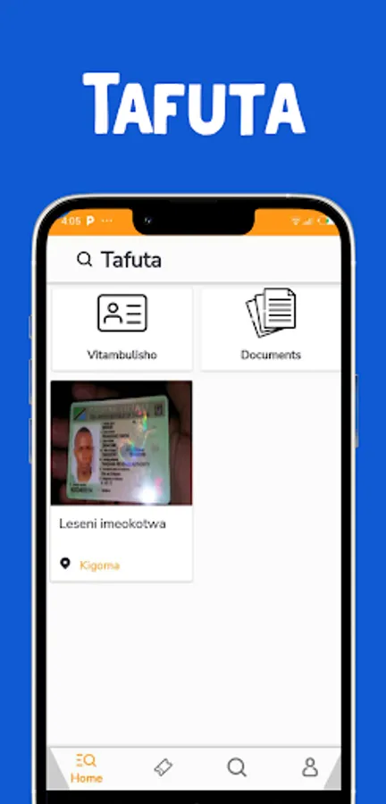 TAFUTA ni app inayokusaidia wewe kutafuta vitu mbalimbali ulivyowah kupoteza kama Vyeti, Vitambulisho, Funguo, Kadi za Benki kwa Urahisi. Na Kama Umeokota Vyeti, Vitambulisho, Simu, Kadi za Benki, Leseni au Kitu chochote kile unaweza kukipost katika App ya TAFUTA na Ukampata Aliyepoteza.