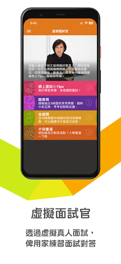 Through virtual live interviews, users can practice interview answers in Cantonese and English. There are also online interview tips. After completing the exercises, users can even review their answering performance in video, so as to improve and increase their chances of being hired.