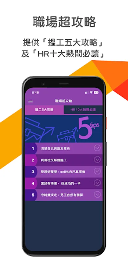 Provides "Five Tips for Finding a Job" and "Top 10 HR Questions You Must Read" for reference, so that users can equip themselves before finding a job or seeing a job.