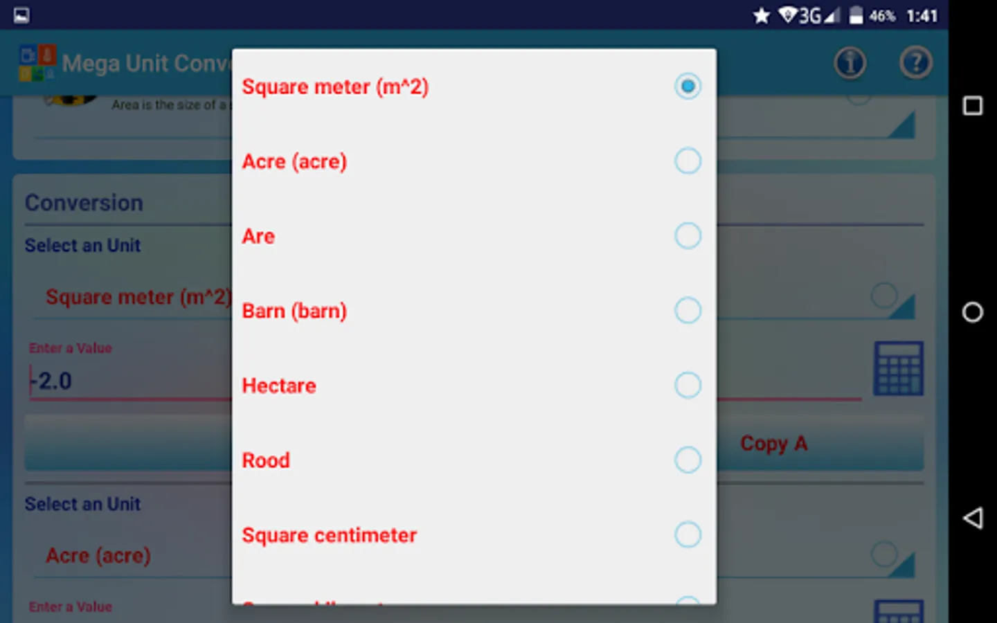 2. Select Meter (m) from [A] drop down list and Enter value 1 in input box or Click or Tap on Calculator Icon placed on right side.