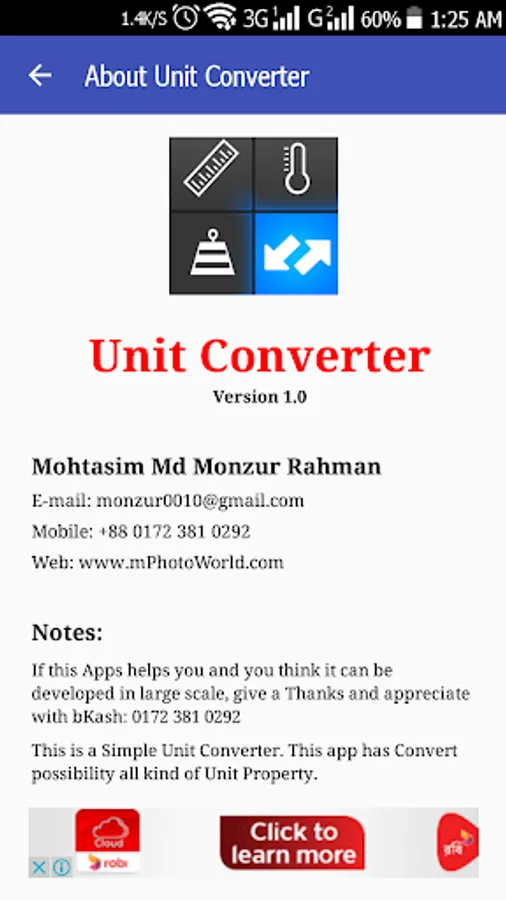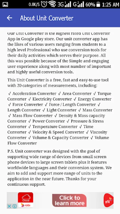 P.S. Unit converter was designed with the goal of supporting wide range of devices from small screen phone devices to large screen tablets plus it features worldwide languages and their conversion system. We aim to add and support more range of units to the application in the near future. Thanks for your continuous support.