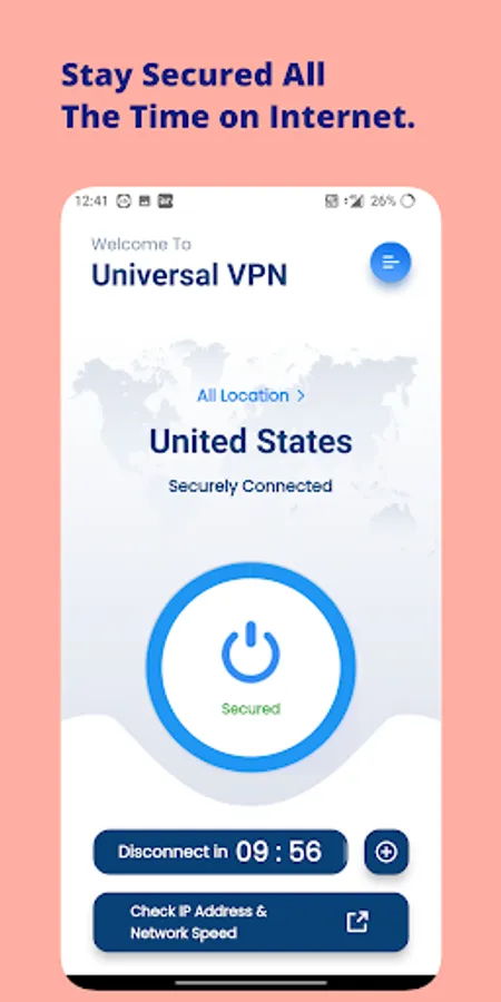 Universal VPN is a light-fast VPN proxy service available around the globe with our super fast VPN Server powered by Amazon Web Service, and there is no need for any configuration, and can connect very easily with single click button and you have access to the internet secured and anonymous.