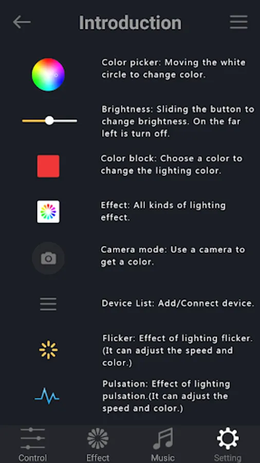 4. camera mode (light changes according to color picked by camera, only for RGB products).