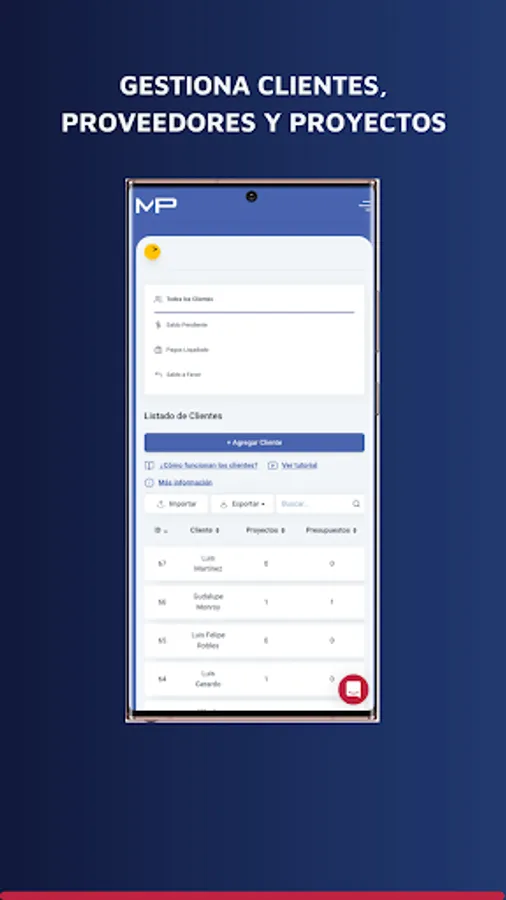- Descarga estados de cuenta de clientes, proyectos y proveedores.