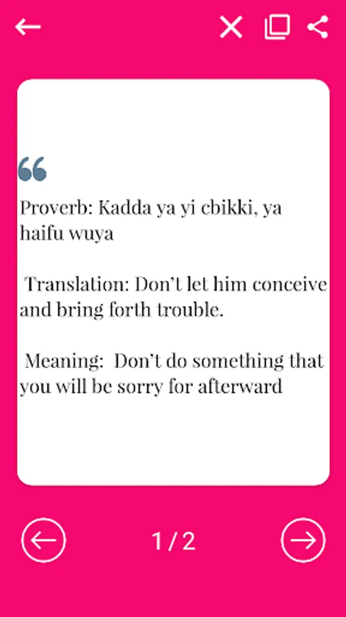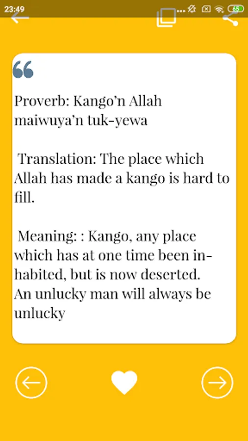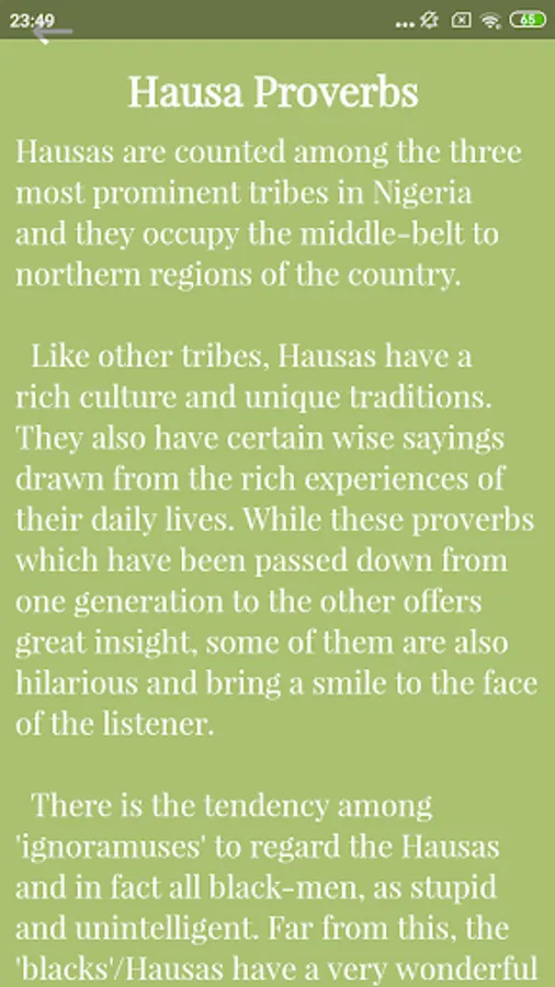 This app is to find the best handpicked Hausa proverbs (Karin Magana) and meanings in English. There are hundreds of best insightful proverbs from authentic indigenous Hausa ethnic group native in Nigeria. You can find the benefits of English and Hausa proverbs. Hausas have a rich culture and unique traditions which rich with wise sayings drawn from the experiences of their daily lives.