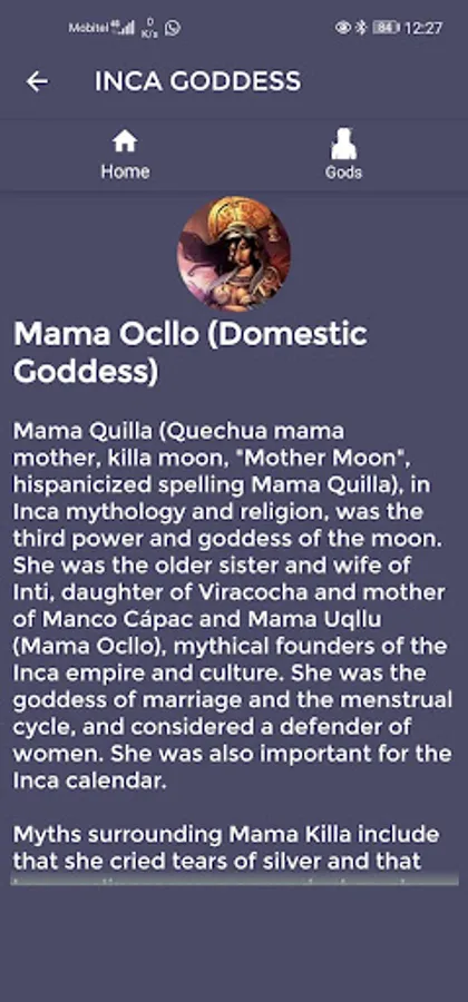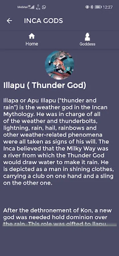 Incas Mythology enriches with so many folklores and myths. However, they have worship so many different gods and goddesses who are much connected to nature where they live. Inca civilization established in modern-day Peru and after the Spanish conquest, most of the records of the Inca people were burned. however, most of the myths and legends were survived among the local peoples of the Andes. This app specially mentions those gods and goddesses separately with their specialty.