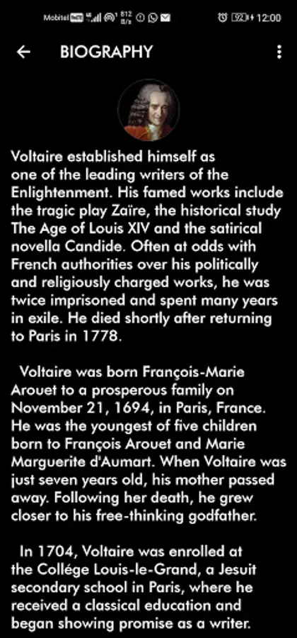 Voltaire was one of the famous french writers who is believed that the first writer who is commercially successful. Its believed that he has written almost 2000 books and over 20,000 letters. The real name of Voltaire is François-Marie Arouet and he is considered the greatest writer of France during the age of enlightenment period. In this app, you can find out the best quotes and biography of Voltaire.