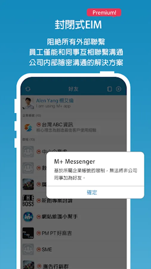 M+ Messenger has been adopted by leading financial holdings, large chain restaurants, media production, medical care, public sector and other institutions to meet your needs in various workplace communication situations. It has also obtained ISO 27001, ISO 27011 information security, ISO 27018, 29100 and BS 10012. Information security certification at home and abroad, such as two-factor authentication for information privacy protection, basic information security specifications for mobile apps formulated by the Ministry of Economic Affairs/Information Policy Council, etc. M+ Messenger is your first choice for corporate instant messaging that takes into account both communication efficiency and information security.