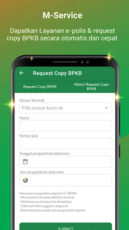 This feature contains customer service to make a booking request for a copy of BPKB by filling out the form on the side. M-Service also has a feature to download e-Policies automatically and easily. Customer information & agreement card can also be viewed on M-Service.