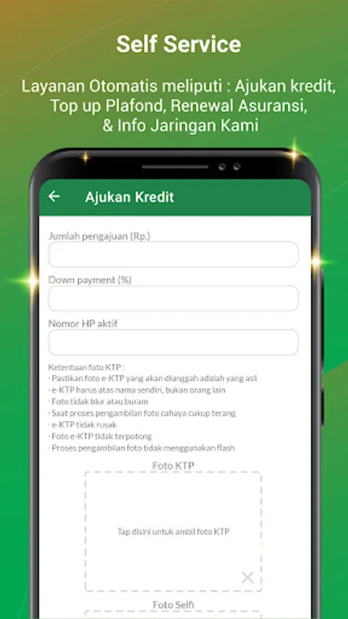 This feature contains Automatic Services including: Apply for credit, Top up Ceiling, Insurance Renewal, and Our Network Info. For customers who want to apply for financing facilities, they can go through the Apply Credit feature in Self Service by filling in the number of submissions, DP, active cellphone number, photo of ID card and click submit.
