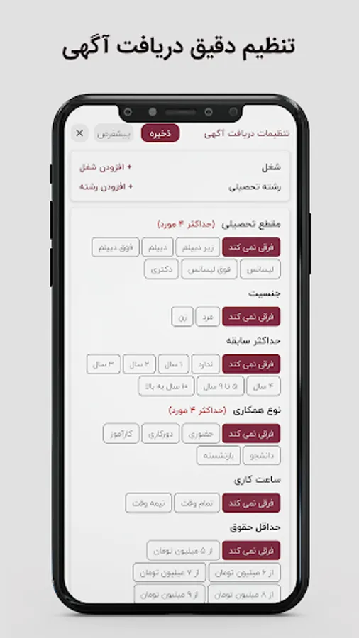 - Setting up notification and detailed notification of employment ads based on "occupation" and "field of study" and "degree" and "gender" and "required experience" and "requested salary" and...