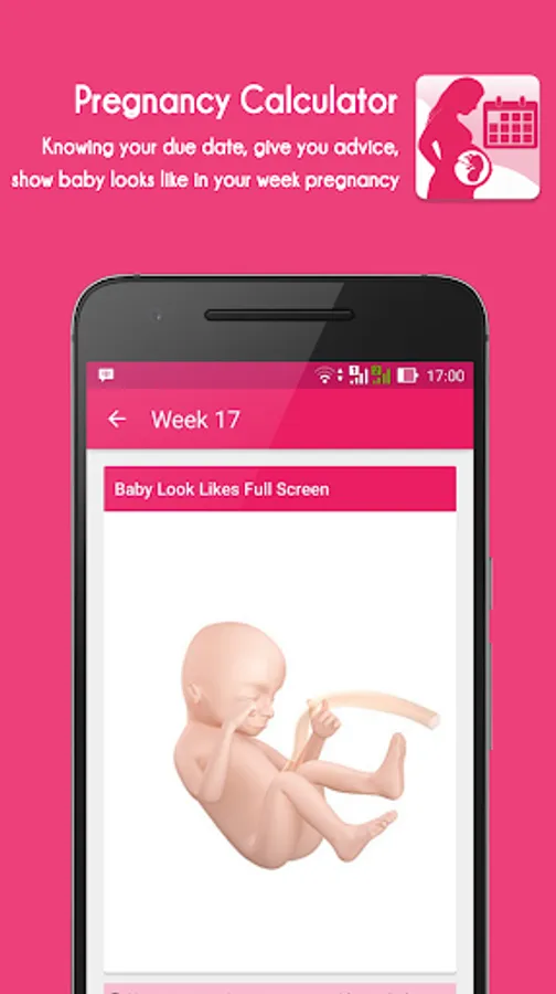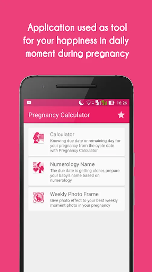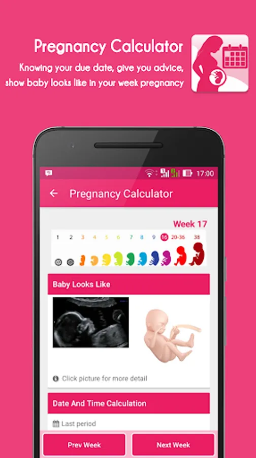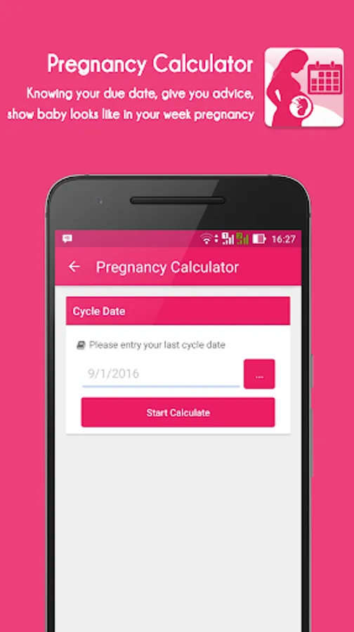 The main feature in this application, Pregnancy Calculator, is giving a lot of information about calculation or prediction of your pregnant. The calculation is coming from when your cycle date, and next application will be calculate when your due date, weeks that passed, remaining week or days, and many more parameter about pregnancy day. It will show you how baby looks like in that week or your week of pregnant.