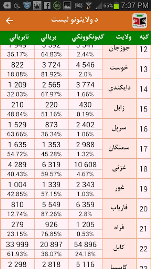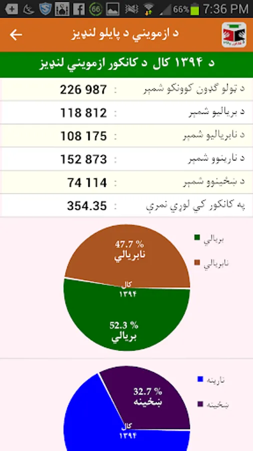 په نوموړي اپلیکېشن کي د کانکور ازمویني پایلي په لاندي ډول وړاندي کیږي؛