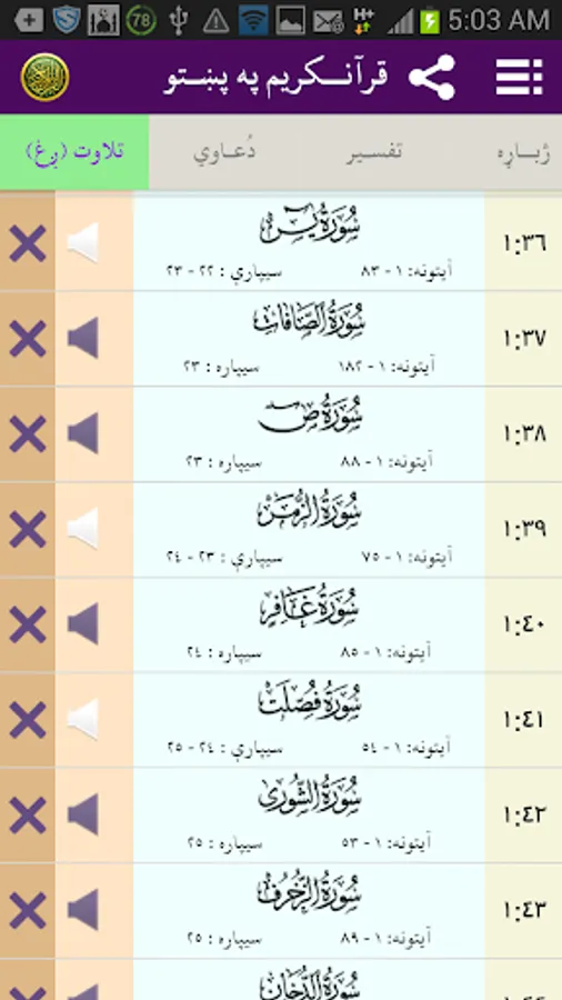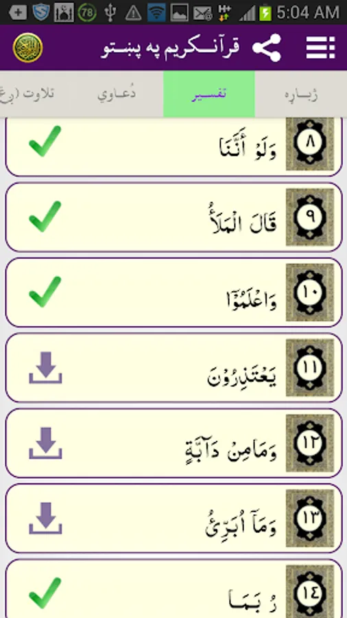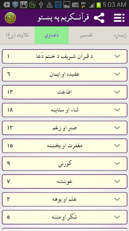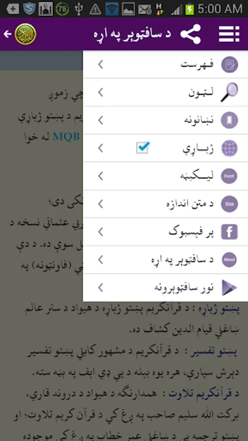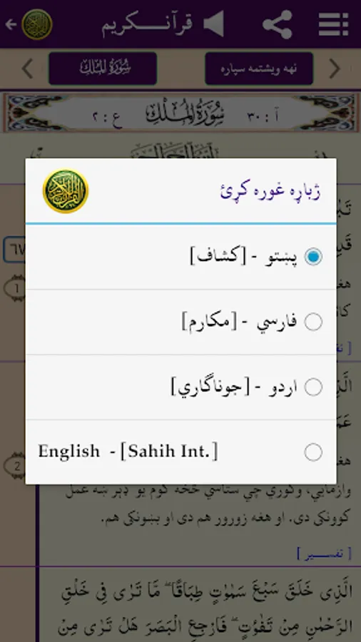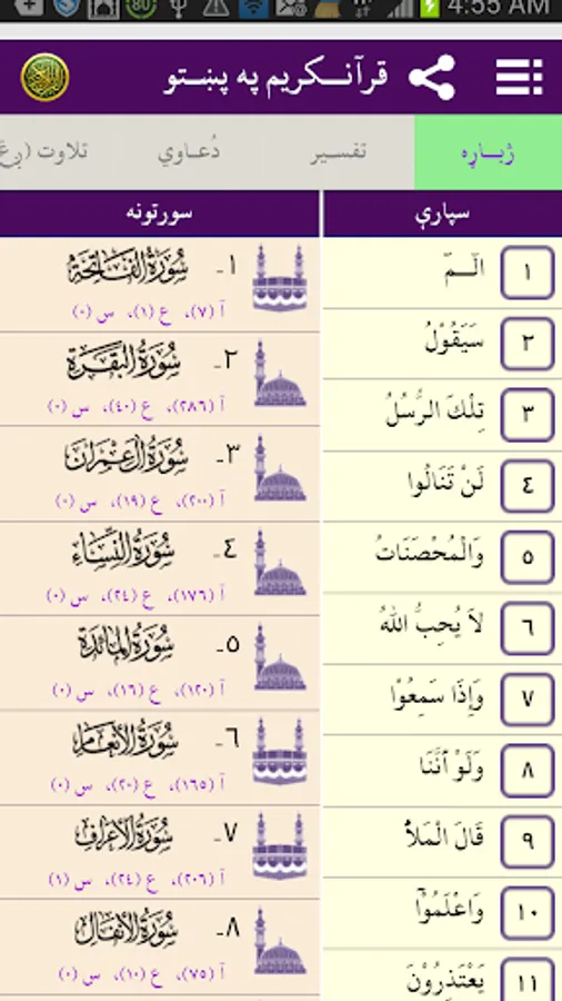 QURAN-i-KARIM IN PASHTO app is for reading and reciting the Holy book Qur'an Karim with four language (Pashto, Persian, Urdu and English) translations and Pashto Tafsir.