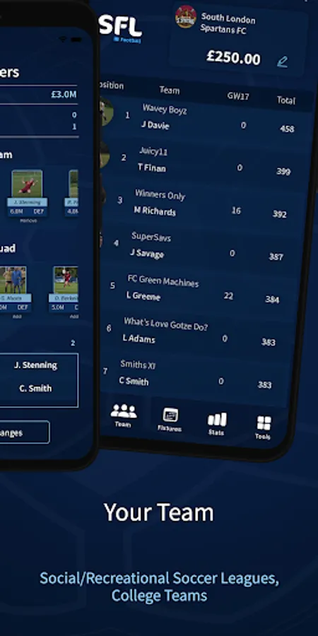 The SFL is the official fantasy soccer app for 11-a-side amateur soccer teams, whether you are a Saturday or Sunday soccer team, a non-league team or even a college team.