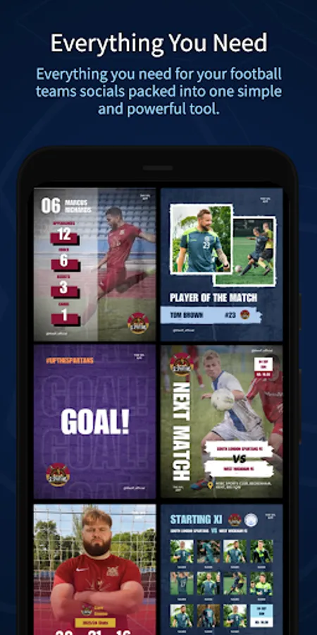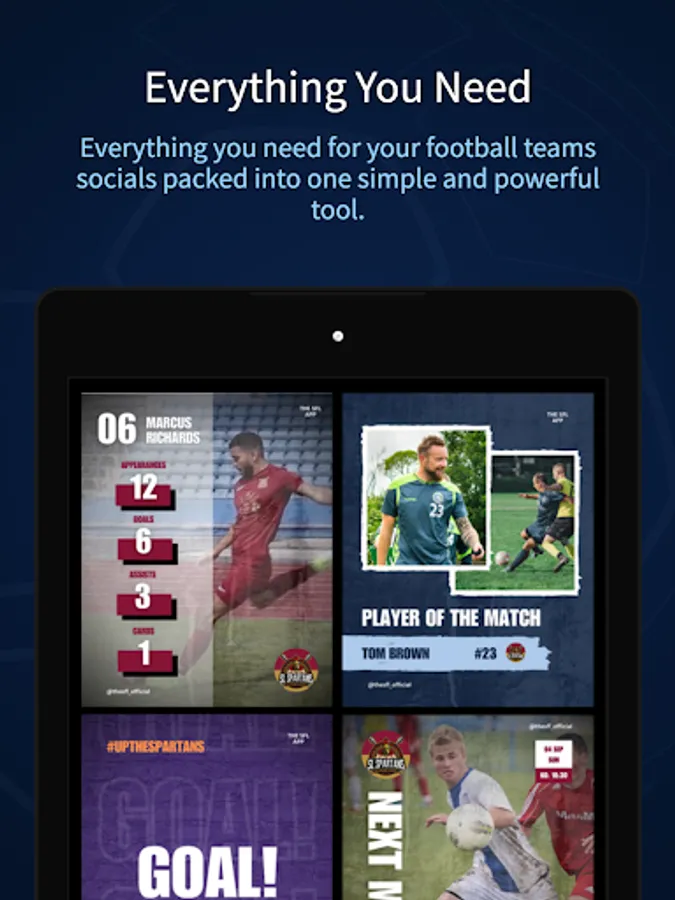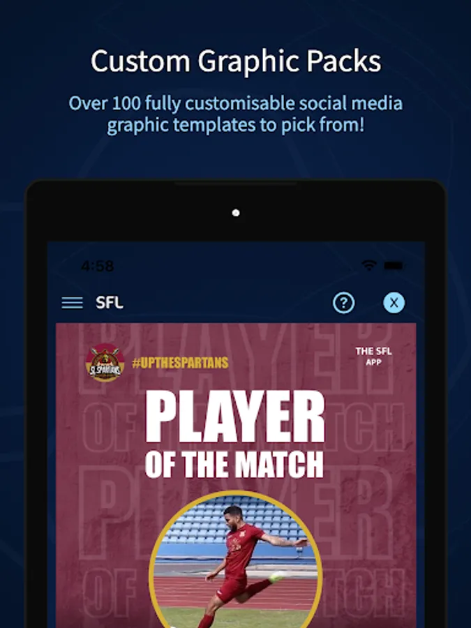 Create epic sports content for your social media pages using our matchday graphic packs! The SFL is the best app for making your own sports graphics for you social media pages, using your own logo and images.