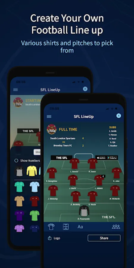 Our line up tool allows you to upload your own player images or select from a wide range of custom soccer kits and shirts. Add subs, your own logo and your own text.