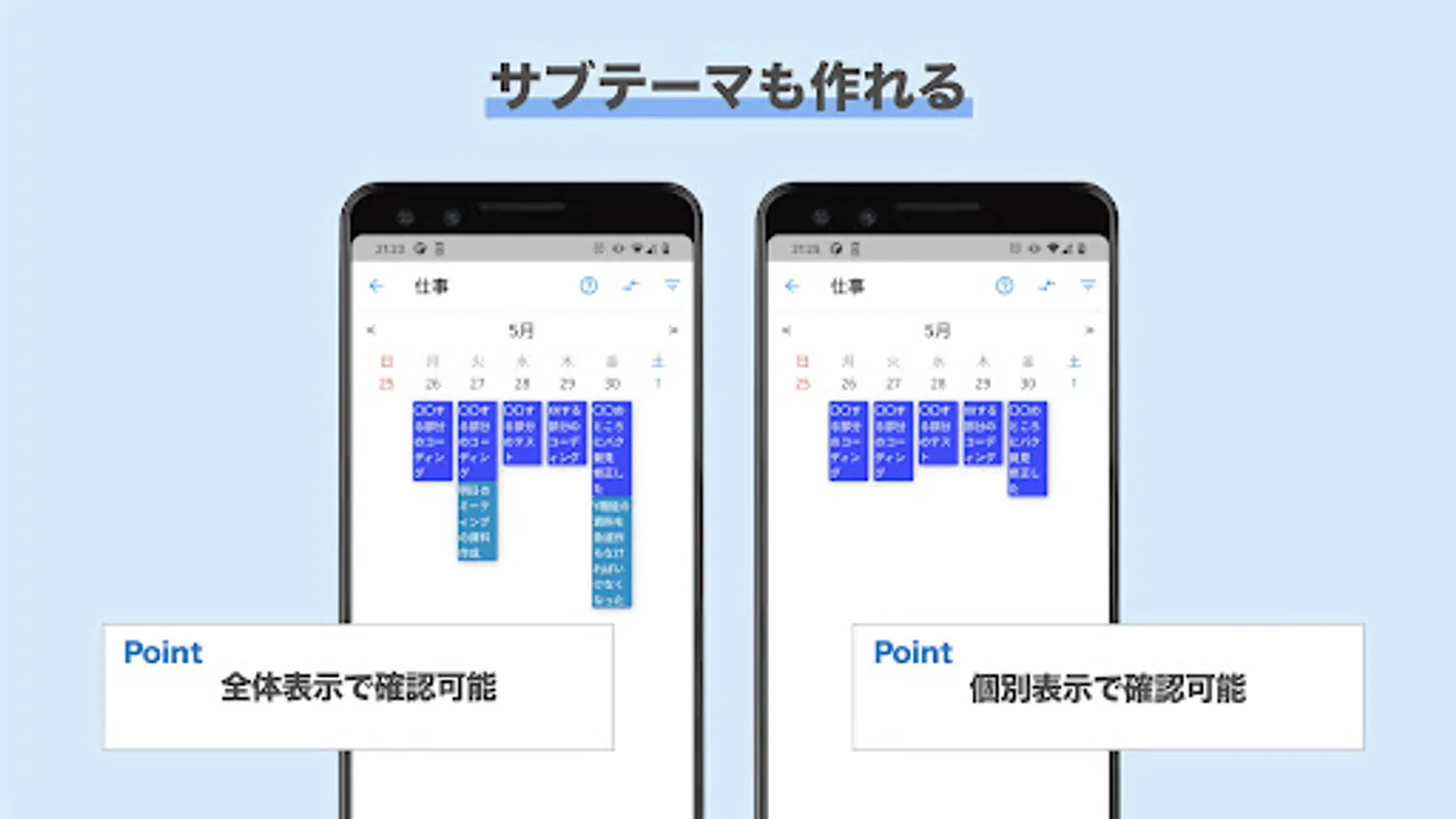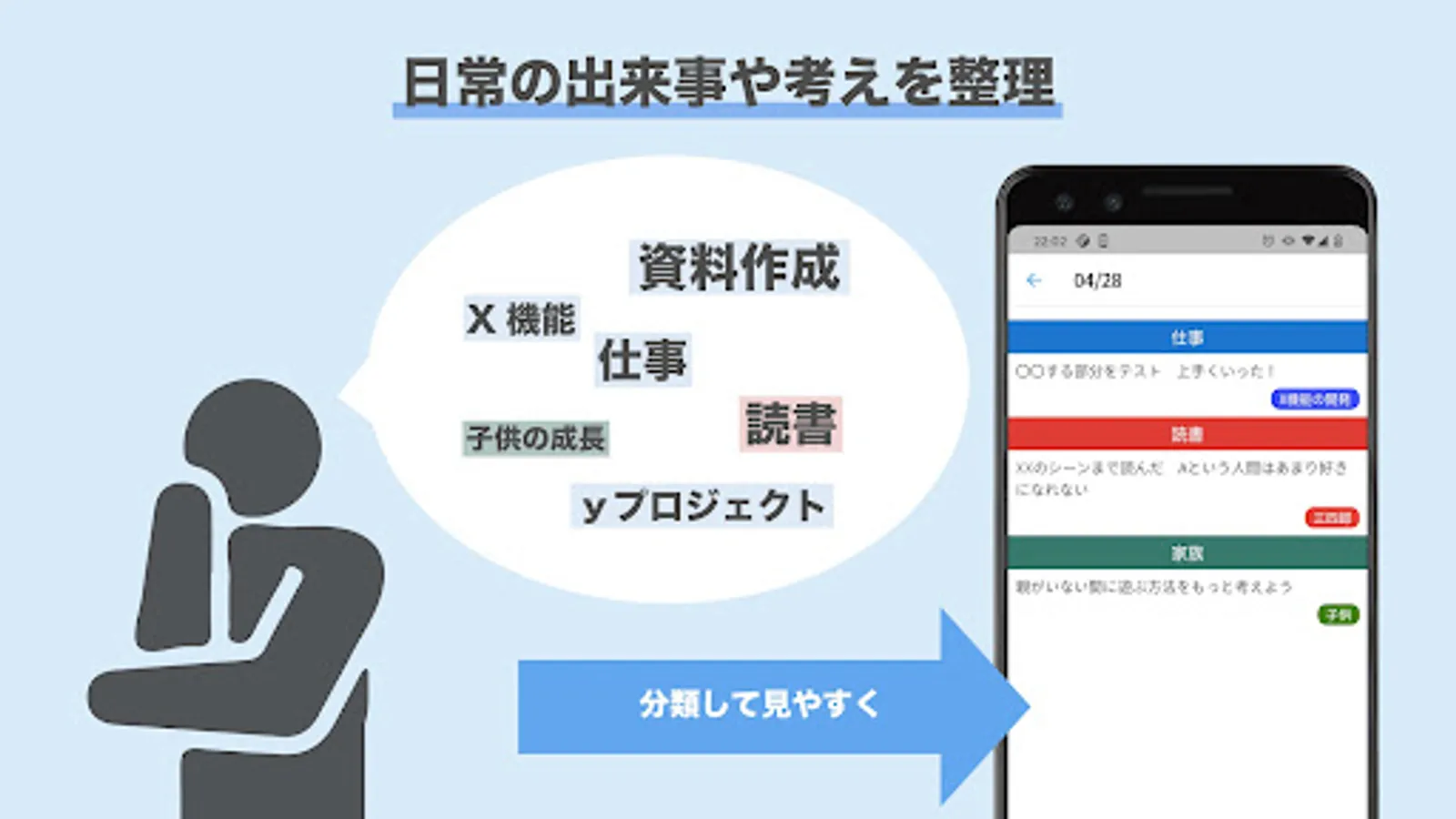 Work, hobbies, home, personal study ... There are various different genres of events in your day. "How was your work progress this week?" "What were you doing as a hobby last week?" It would be convenient to look back on each of these genres. This application is a diary application that allows you to set a "sub-theme" in the "theme" and the theme, and post and record the theme and sub-theme in the diary.