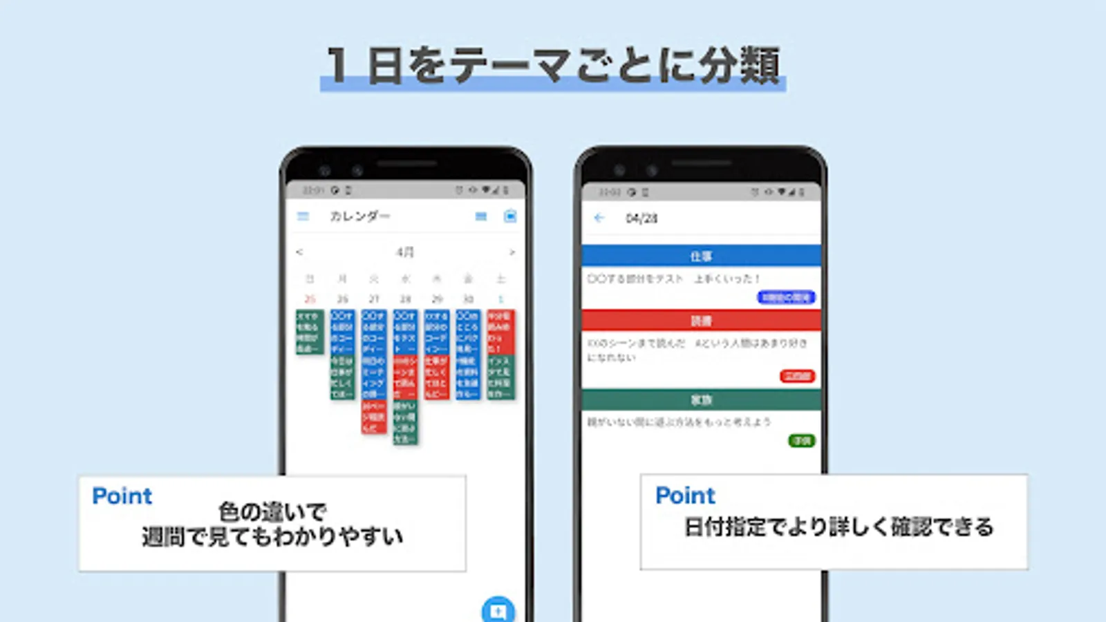 The recorded diary is displayed in different colors for each theme on the calendar.