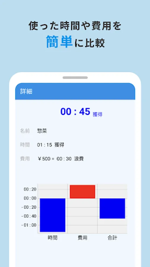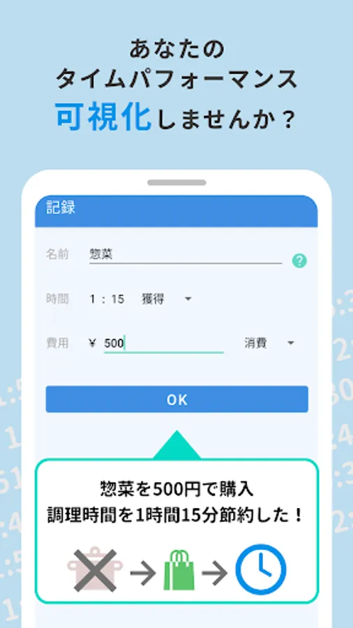 Is it really a good idea to go to a supermarket separated by 30 to buy a product cheaply for 200 yen? Is it really a waste to buy a side dish to save cooking time? Time performance is important, isn't it? This app calculates and records the time spent/gained based on the time spent, the cost, and your hourly wage. From your records so far, visualize your total time spent and evaluate your time performance!
