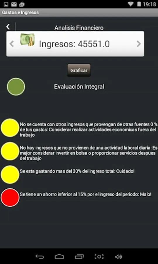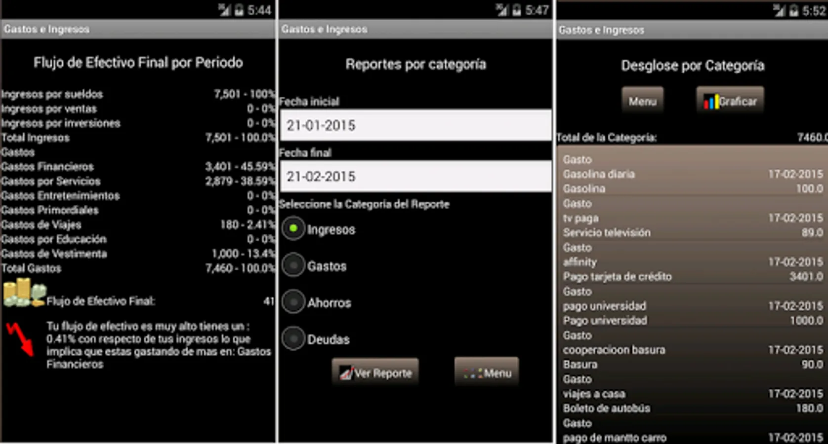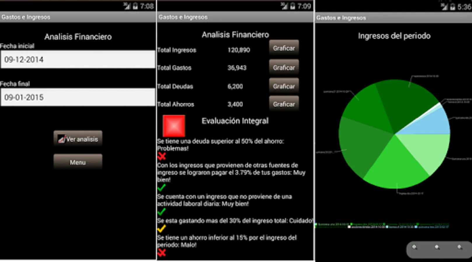 Expenses and income is an application that helps you control your expenses and your income and classify them, get monthly reports for periods graphic, carry out precise verification of savings and debts, access to a calculator and finally a financial analysis that you It gives through a traffic light in relation to your financial situation, giving you options to improve your financial situation.