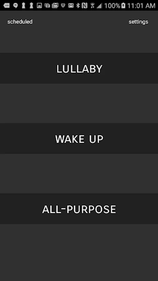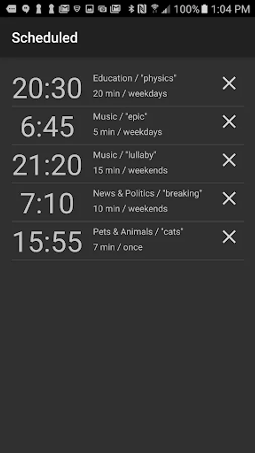 LULLABY: quickly schedule some videos to fall asleep to. The videos are picked at random from a pre-defined category (e.g. music), with a pre-defined search keyword (e.g. "lullaby"), and lasts for a pre-defined amount of time. These can be changed to your preference in the settings.