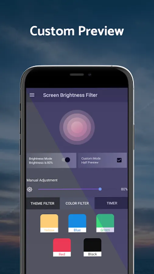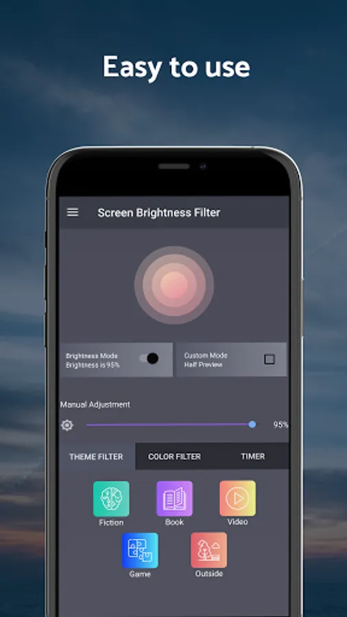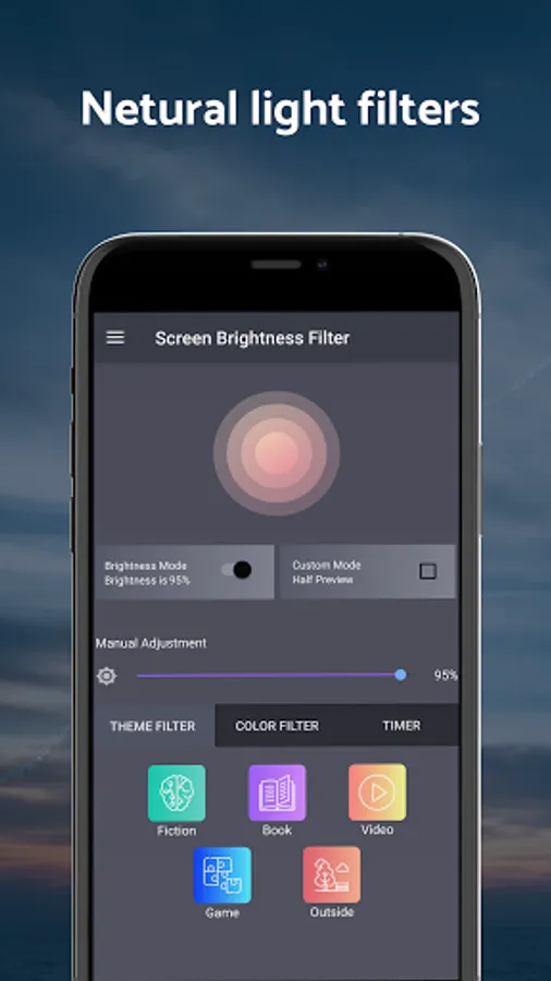 After the installation of the Screen No Strain Eye - Screen Filter, it will automatically increase the brightness or reduce the brightness of the Mobile screen to protect the eyes, the default setting will reduce the brightness of 10%, and you can manually adjust it. Drag the progress bar to the left to decrease the brightness, the screen will darken, to the right to drag the progress bar will increase the brightness, the screen will light up.
