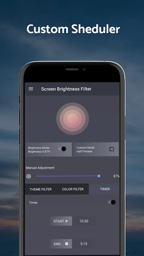 Screen No Strain Eye - Screen Filter is a screen dimmer application that controls the brightness of the Mobile's screen, when you work in a light or darker environment it can help you, It can dim all screens, Screen No Strain Eye - Screen Filter