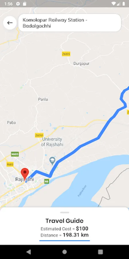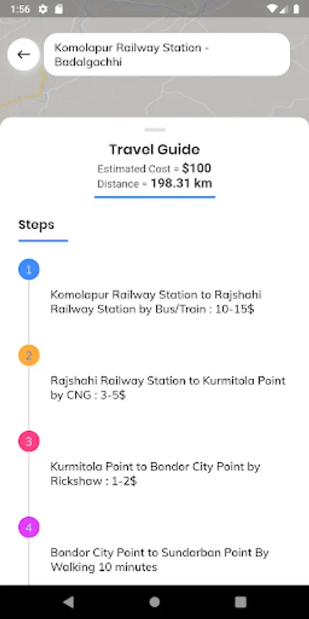 * Travel Guide – It includes a map showing routes between source location and destination location, Estimated price, and steps to go that destination.