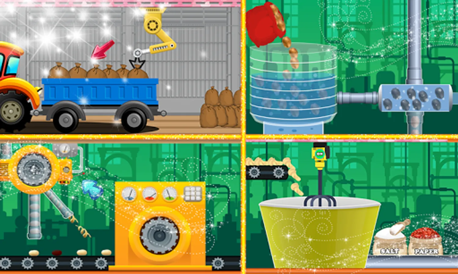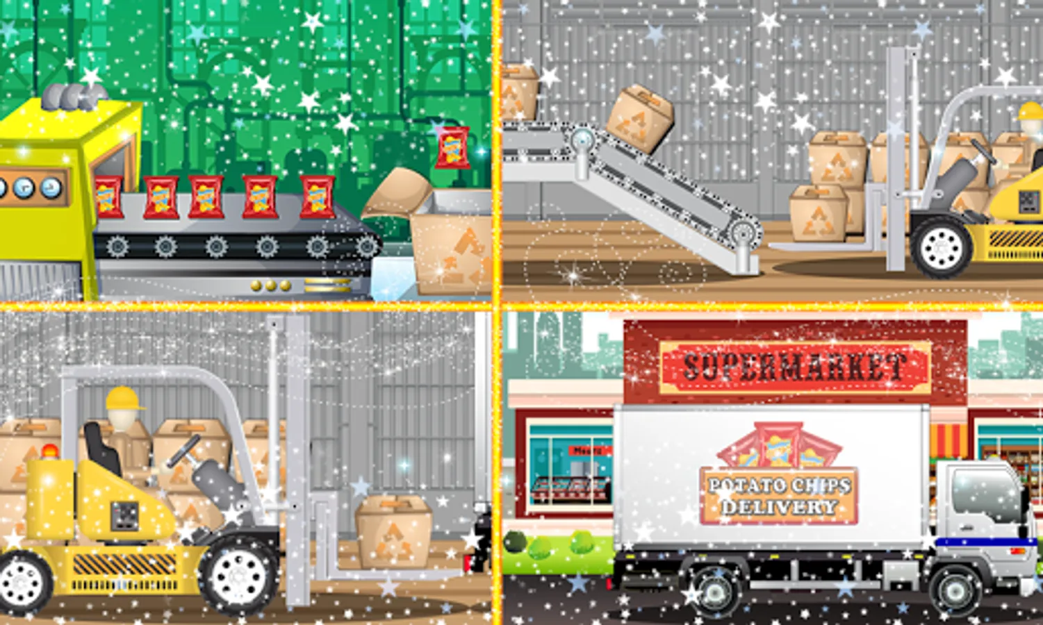 Enjoy yummy flavors of French fries and fun steps of potato chips maker in a factory simulator.
