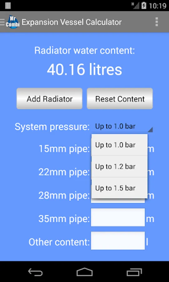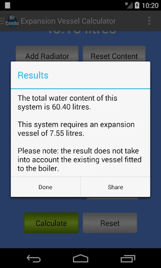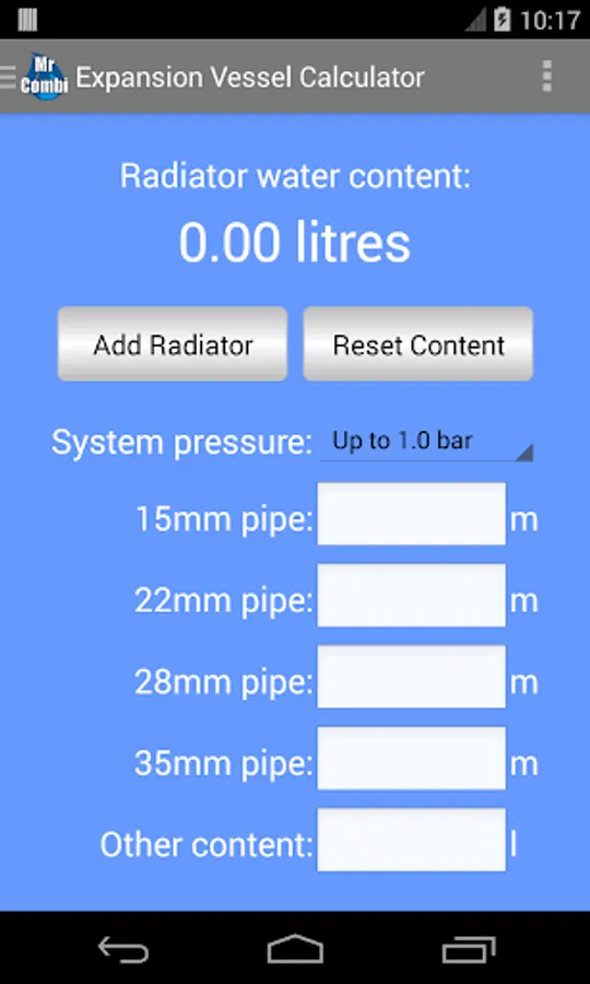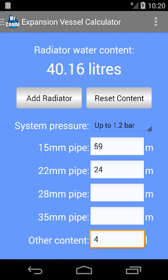 You will no longer have to use any inaccurate methods that calculate the water content from the boiler size. Use the app to find the water content of each radiator in turn for the entire house. Then enter the estimated length of 15mm, 22mm, 28mm and 35mm pipes, add any additional water contents such as for the boiler (2-4 litres normally) and a towel rail and then press the 'Calculate' button.