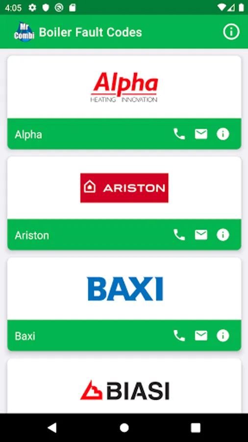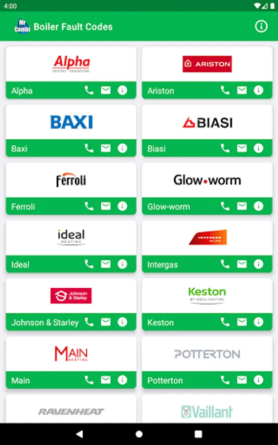 • View contact details for each manufacturer by tapping on the i button below the logo